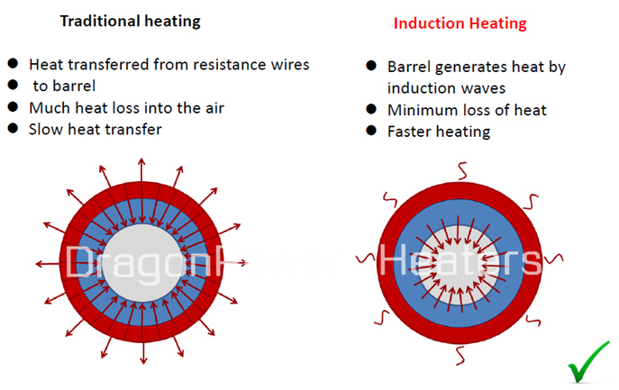 Induction coil itself is not heated but the barrel generates heat so the heat loss to environment is kept minimum.